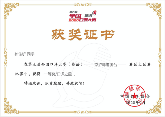孙佳昕荣获赛区第一名(一等奖)及口译之星