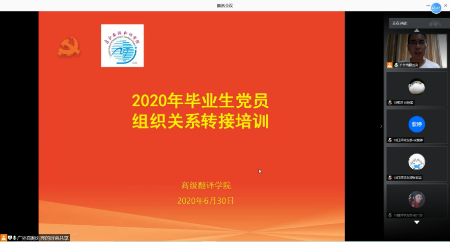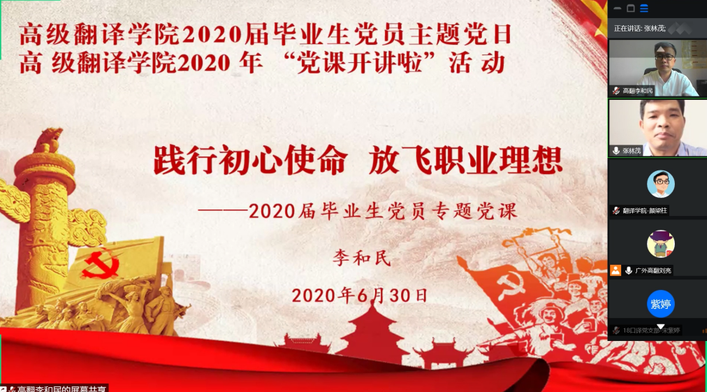 6月30日,为庆祝中国共产党成立99周年,我院举行线上2020届毕业生党员主题党日暨2020年“党课开讲啦”活动。学院党委书记李和民讲了“践行初心使命,放飞职业理想”专题党课,学院全体2020届毕业生党员、教工党支部和各学生党支部支委、辅导员等110多人参加。主题党日活动由学院党委副书记张林茂主持。