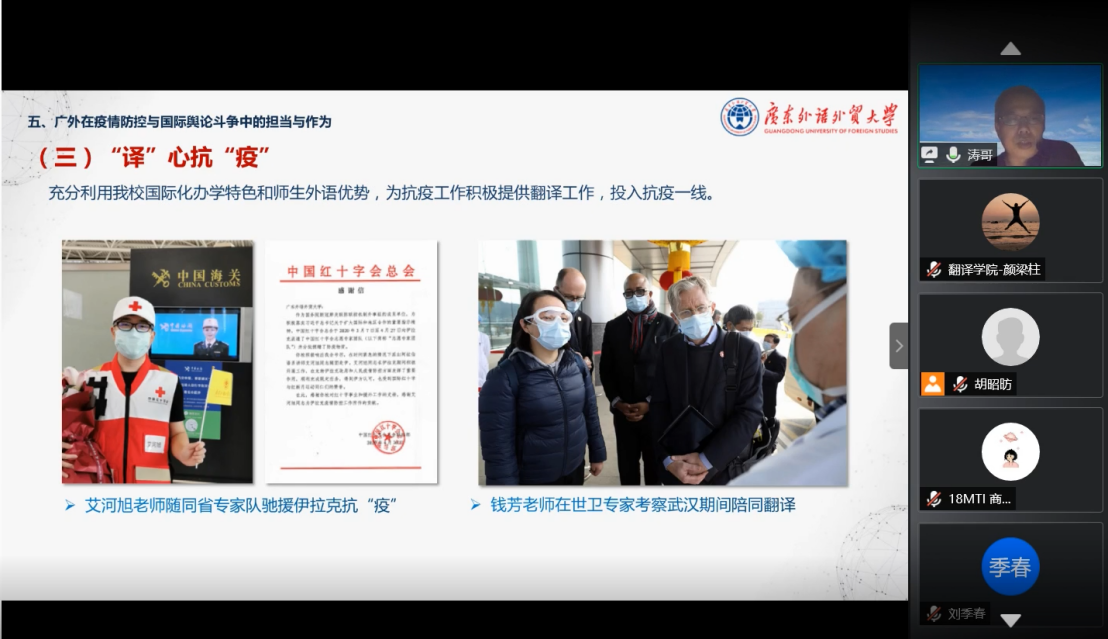 最后,胡文涛展示了我校在疫情防控与国际舆论斗争中的担当与作为。学校党委第一时间科学决策,统一部署,发表云山时评,汇聚广大师生、校友、社会力量凝心抗“疫”。同时动员外教、留学生、国际合作院校友人主动为中国发声,让国际人士了解中国实际状况,同心抗“疫”。我校师生充分利用专业优势,“译”心抗“疫”,充分发挥我校国际化办学特色和师生外语优势,为抗疫工作积极提供翻译与志愿服务,投入抗疫一线。