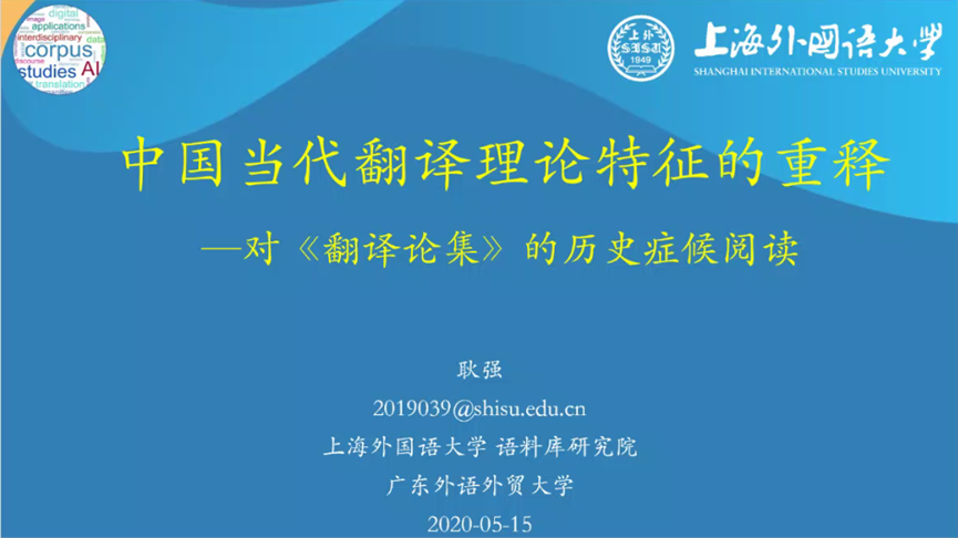 5月15日下午,由广东外语外贸大学教师发展中心主办、广东外语外贸大学高级翻译学院承办的云山教师沙龙第106讲、岭南译学前沿讲座第196讲在腾讯会议室举行,并通过“译直播”和“bilibili”网络平台面向全国同步分享。上海交通大学外国语言文学博士后、上海外国语大学语料库研究院专职研究员耿强副教授应邀进行了主题为“中国当代翻译理论特征再阐释——对《翻译论集》的历史症候阅读”的学术演讲。本次讲座采用现代信息技术手段,为广大翻译从业者和爱好者提供了学习与交流的平台。
