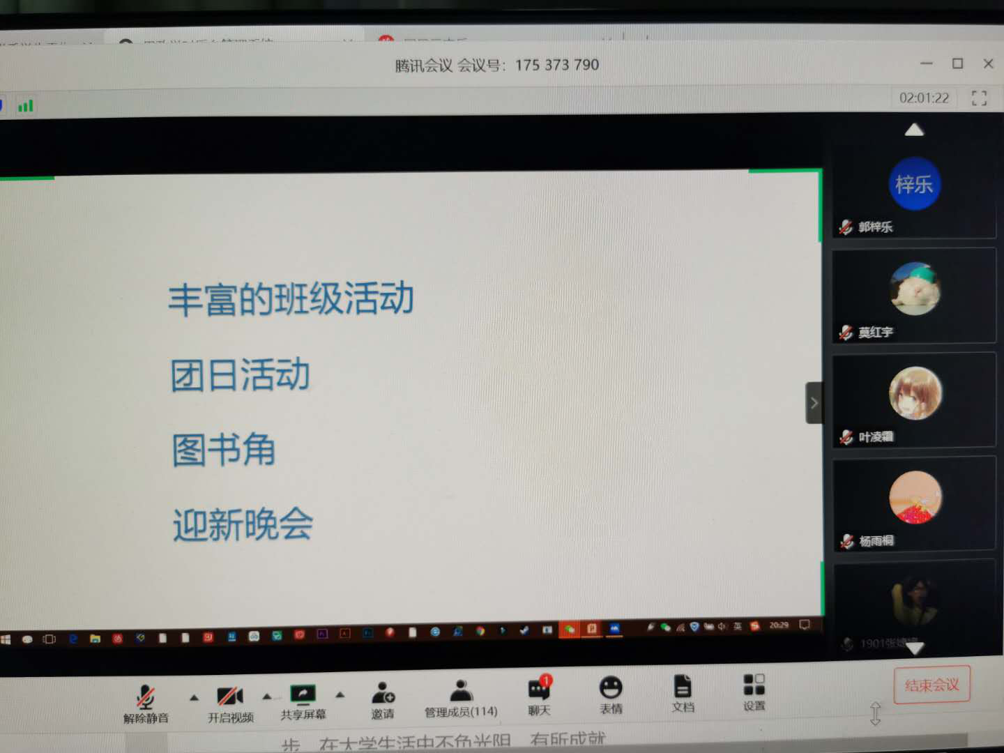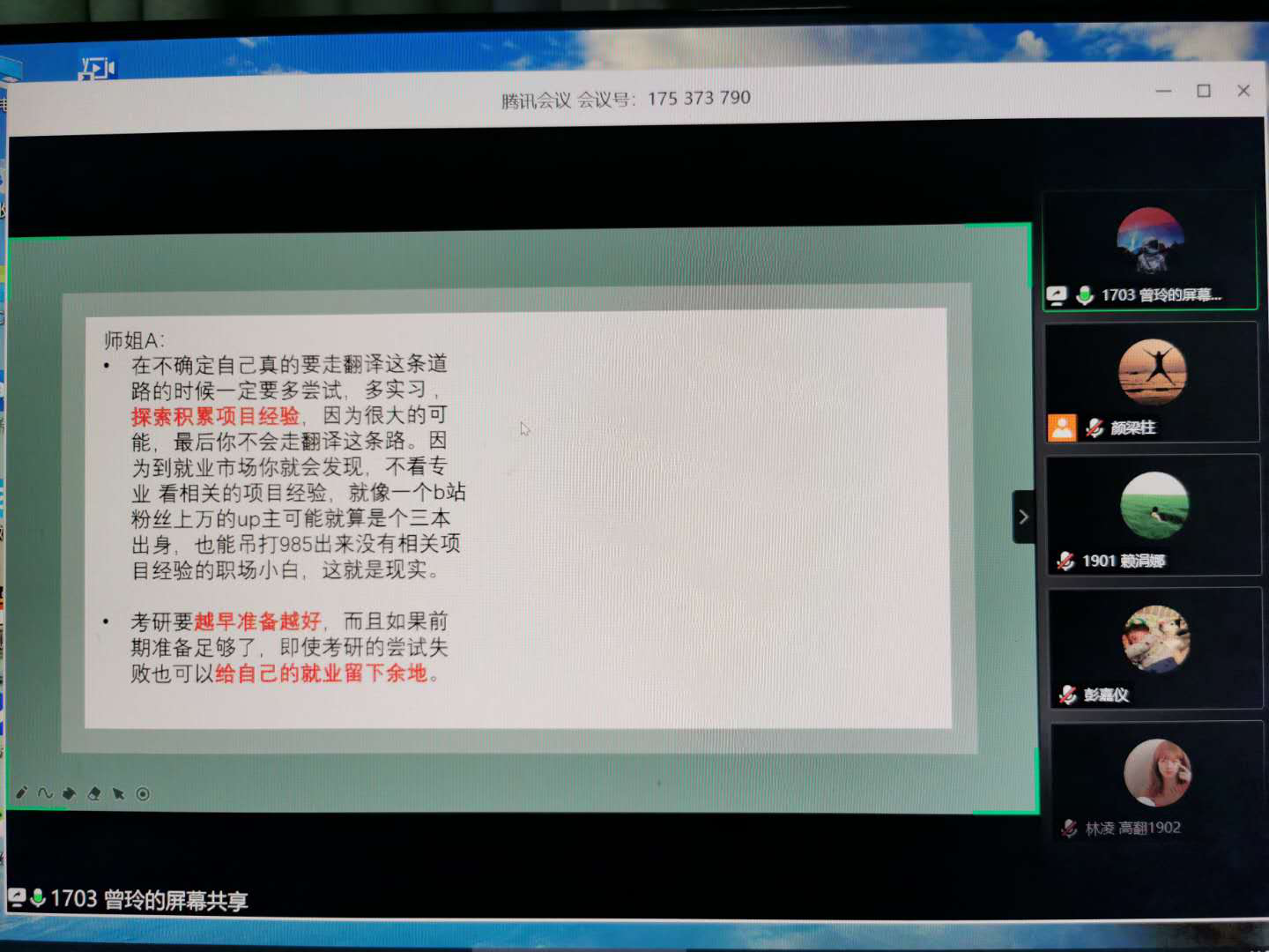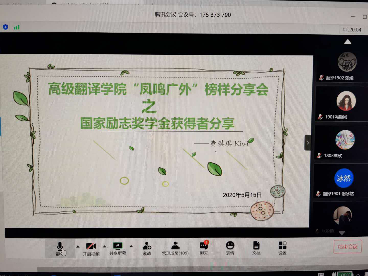 为充分发挥优秀学生的先锋模范作用,培养学生的责任意识,培养感恩社会之情,激励广大学生成才报国,5月15日,我院开展“凤鸣广外”榜样分享会暨“爱国力行·青春榜样——榜样与你面对面”活动。国家奖学金获得者曾玲、国家励志奖学金获得者黄琪琪、一等奖学金获得者杨诚洁和先进班集体学生代表通过腾讯会议平台与2018级、2019级本科生面对面交流,分享学习与生活的心路历程,激励学子们努力奋进,勇担使命。学院辅导员颜梁柱主持本次分享会。