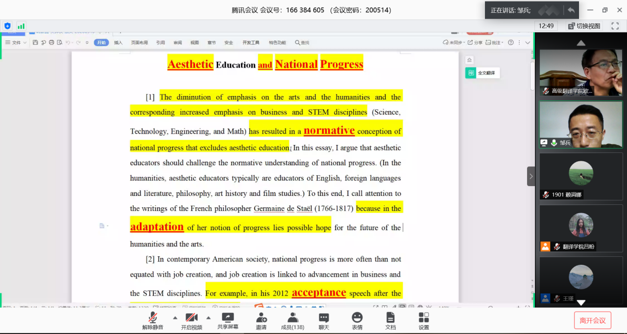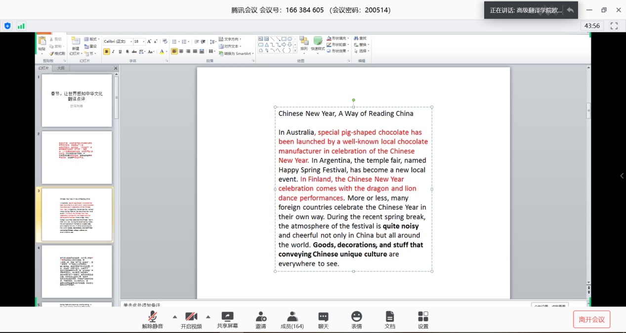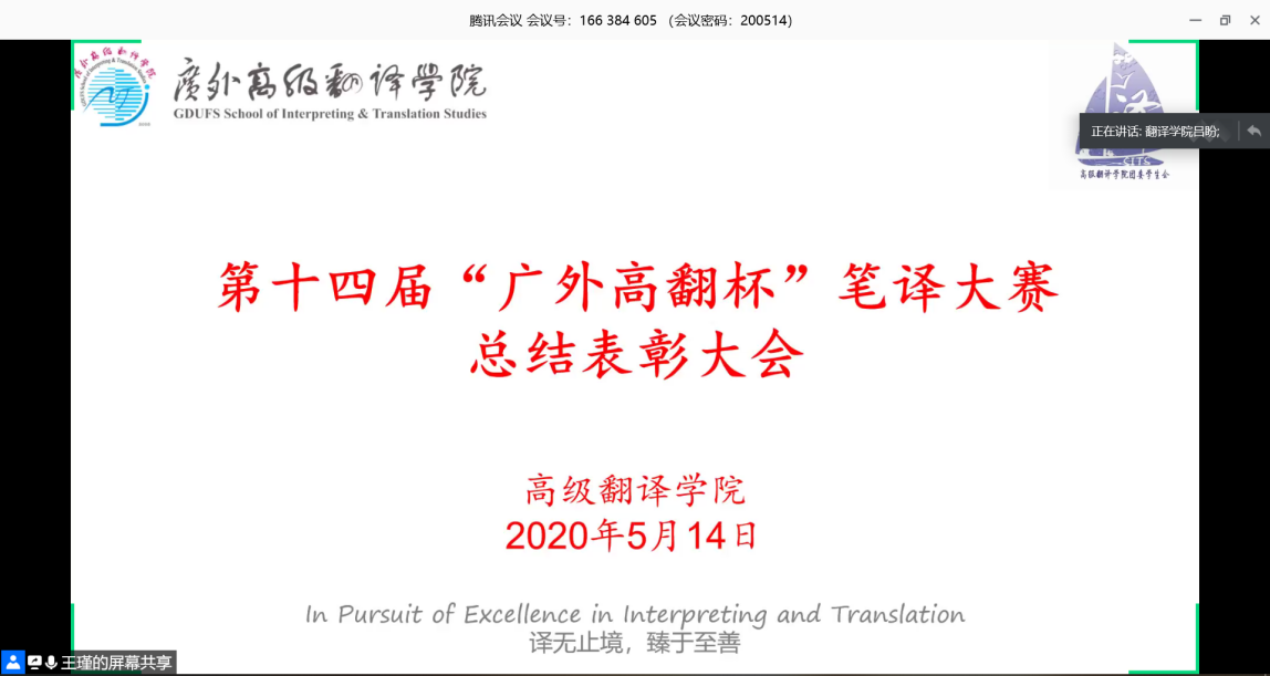 近日,第十四届“广外高翻杯”笔译大赛总结表彰大会在腾讯会议平台线上举行。学院党委书记李和民、学院副院长胡正茂、笔译系主任欧阳利锋、笔译系老师康志洪、邹兵、田璐和学院辅导员等出席本次大会。参加本次大会的还有来自高级翻译学院、英语语言文化学院、西方语言文化学院、国际商务英语学院、法学院等150余名参赛选手。