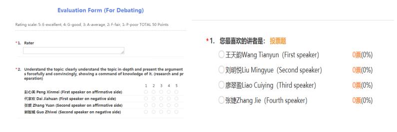 本次活动实现了所有评分数字化自动化,创新了线上评分方式,通过问卷实时评分,由评委老师最终评选出最佳讲者、最佳辩手、最佳译员,观众通过二维码扫码投票最受欢迎讲者以及最受欢迎辩手。