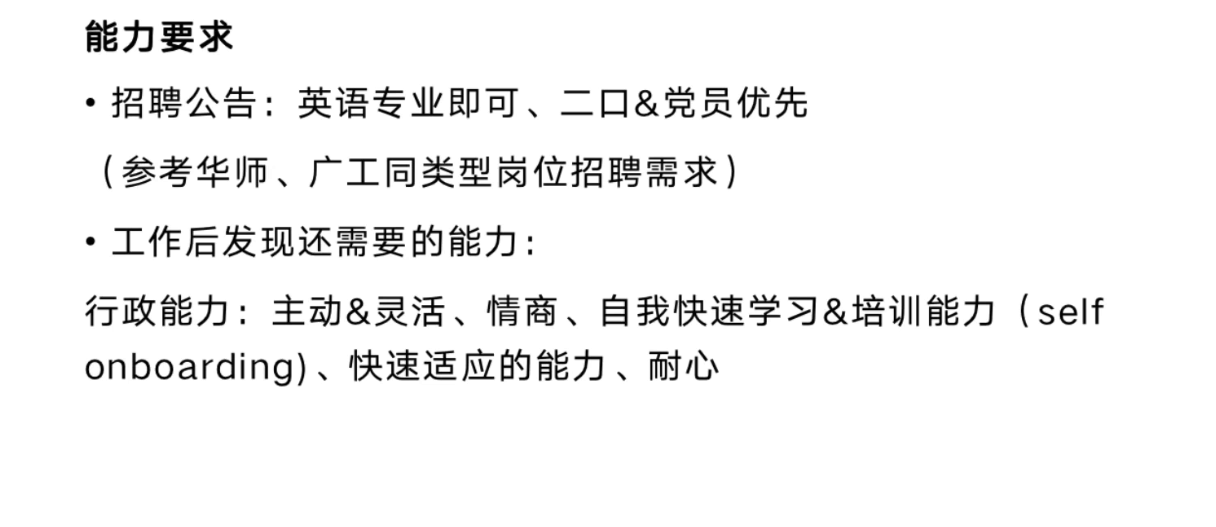 王小羽认为高校行政岗位的职能是服务整个学校的发展,和各个部门联动、合作至关重要。此外,国际交流处需要与海外学校的对接人合作,内容主要包括签协议,这意味同学们需要对法律文书有所了解,培养法律翻译能力。