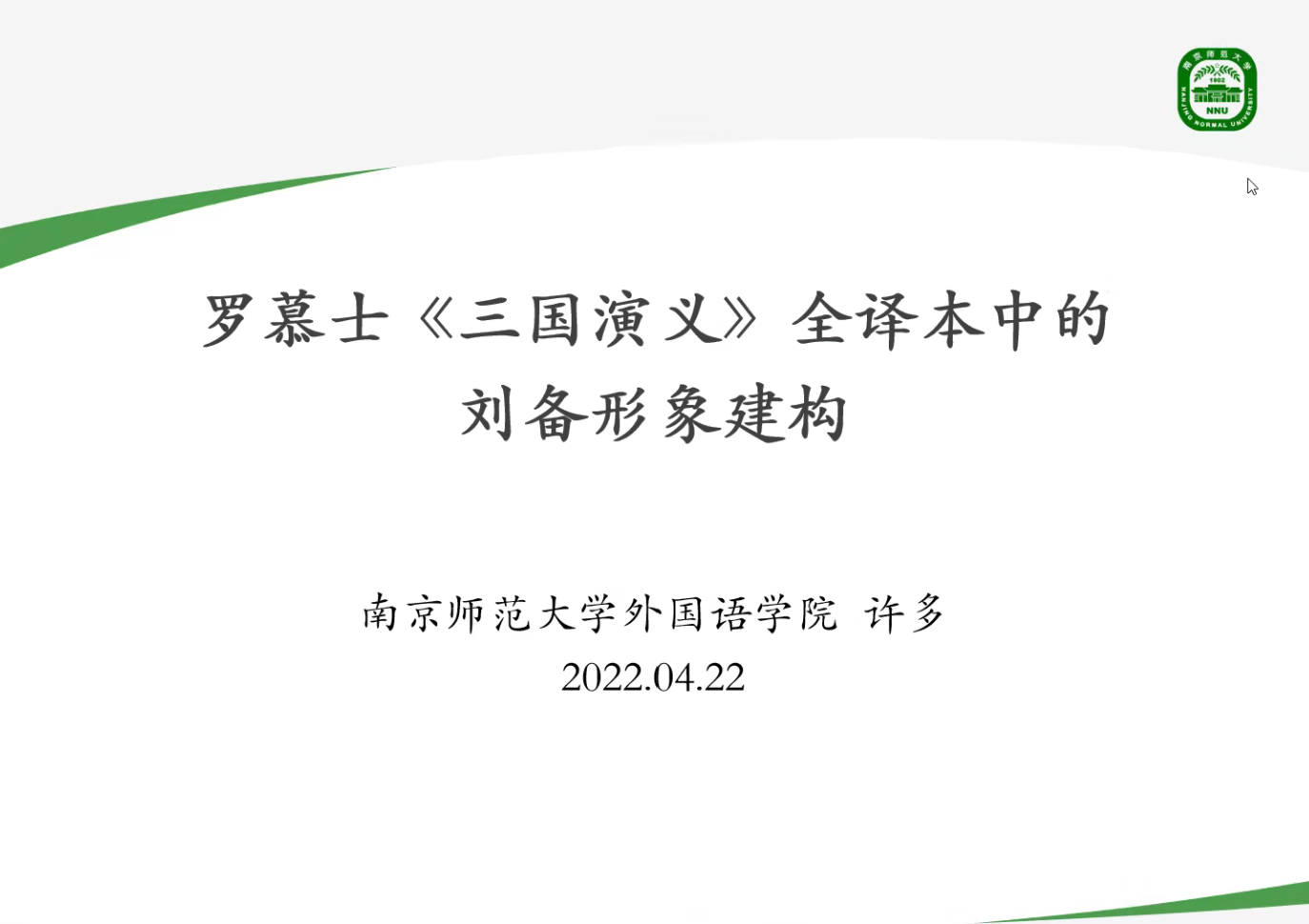 4月22日下午,由广东外语外贸大学人事处、教师发展中心主办、广东外语外贸大学高级翻译学院承办的云山教师沙龙第124讲、岭南译学前沿讲座第238讲在腾讯会议室举行。南京师范大学外国语学院副院长许多教授应邀进行了主题为《罗慕士<三国演义>全译本中的刘备形象建构》的学术演讲。本次讲座由广东外语外贸大学高级翻译学院副院长王巍巍主持,并在Bilibili平台同步直播,为高级翻译学院师生及广大翻译爱好者提供了学习与交流的平台。