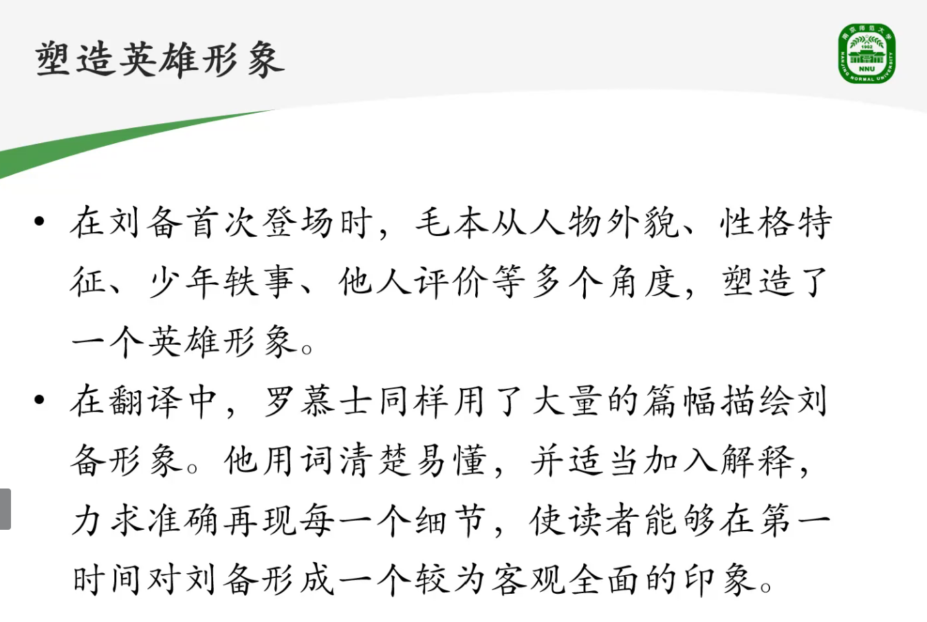 首先,许教授分析了作品、人物和读者这三者之间的关系,指出译者是最为特殊的读者,译者如何理解和阐释原作人物是原语文化能否被译语读者所接受的一个重要因素,更是两种文化相互交流的关键前提。接着许教授以名著《三国演义》的罗慕士译本引入话题,来介绍三国人物的形象建构。许教授以三国中的英雄人物形象为主题,介绍了罗慕士对曹操、刘备等英雄人物的描写。许教授指出,罗慕士对原文的阐释体现了其学术自觉,他所翻译的《三国演义》绝不仅仅是让西方读者管中窥豹般看到毛本中的三国世界,更是展现了一个从真实历史到小说故事的宏大三国图景。