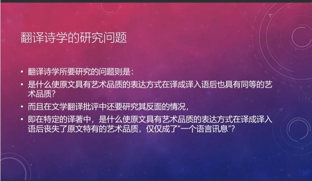 随后,王教授由诗学引入翻译诗学。翻译诗学是诗学在文学翻译研究中的应用,是一门研究文学翻译的学问,主要是研究原文文学性的生成理据。翻译诗学为研究诗学在不同阶段对文学翻译所产生的影响,有史学研究的性质。但是,本着与时俱进的原则,方法论的落脚点会落在客观实践之上,有一个基本的价值观价值体系,而且对于文学翻译来说也最有借鉴价值。