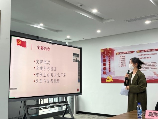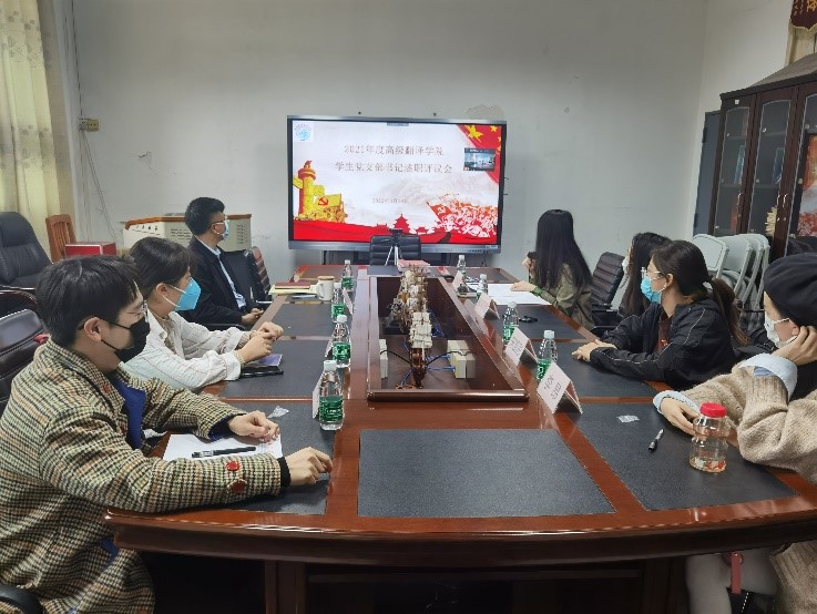 会上,各学生党支部书记分别就履职情况、工作成效、存在的问题和未来计划等方面进行汇报。其中研究生口译党支部重点介绍了支部品牌活动“译说中国”;研究生笔译第一党支部侧重党建引领制度和组织生活;研究生笔译第二党支部着重强调了支部工作如何进一步规范化、成员如何加强合作;研究生翻译学党支部介绍了在夯实党建工作基础,强化组织建设方面下的功夫;2019级研究生翻译学党支部重点展示了《2019级研究生翻译学党支部纪律手册》的制定以及实施情况;本科生党支部从党史学习教育的具体学习和活动展开;博士生党支部则侧重于支部科研成果、党史学习教育与专业相结合的情况。