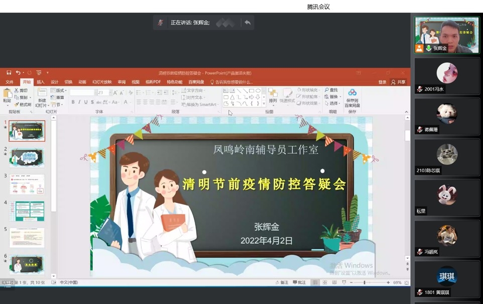 清明假期即将到来,人员流动将会明显增快,疫情的传播风险也随之增大。为确保学生健康出行、安全过节, 4月2日晚翻译学院组织全体本科生召开清明节前疫情防控答疑会,高级翻译学院团委书记、辅导员张辉金老师为同学们解读了防疫政策。受疫情影响,本次答疑会通过腾讯会议平台线上举行。