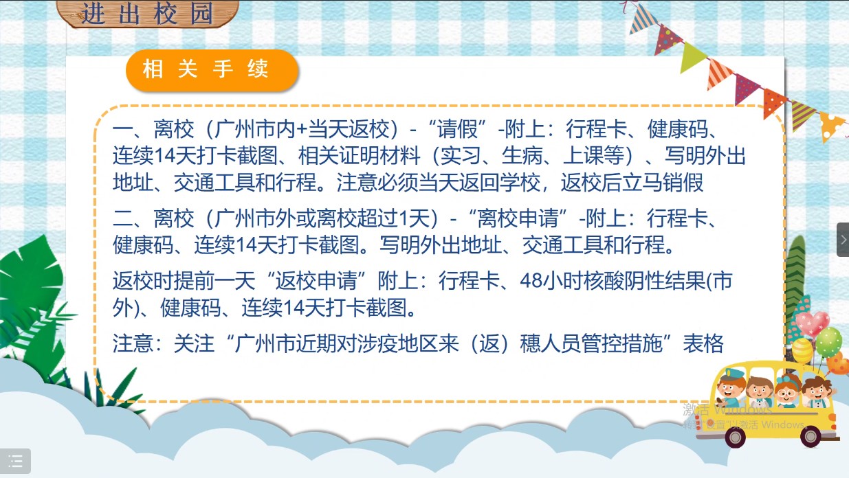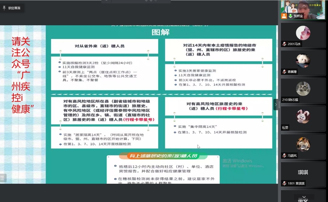 张辉金老师首先为同学们讲解广州市疫情防控管理要求,并推荐同学们关注公众号“广州疫控i健康”,以便了解更多最新的防控政策。同学们积极配合,与老师进行线上互动。