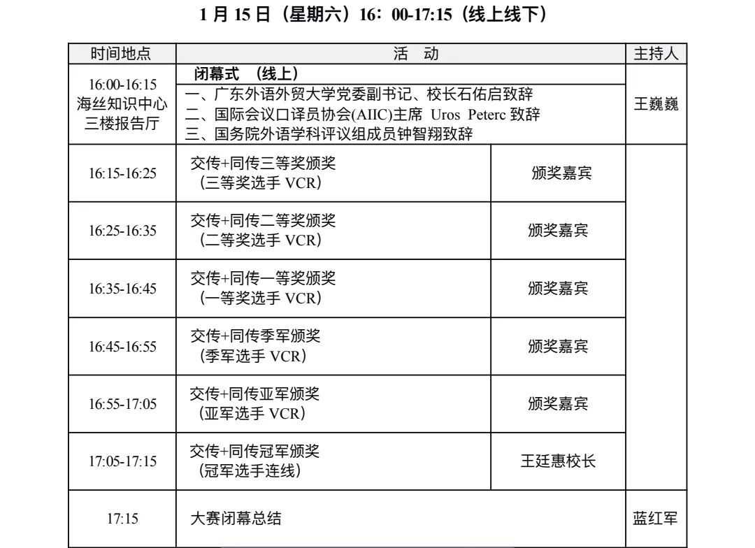本次总决赛以“文明互鉴·我的中国故事”为主题,设置13个外语语种中译外,以真实远程口译工作平台为依托,开展交替传译和同声传译高水平竞技。现将总决赛议程公布如下: