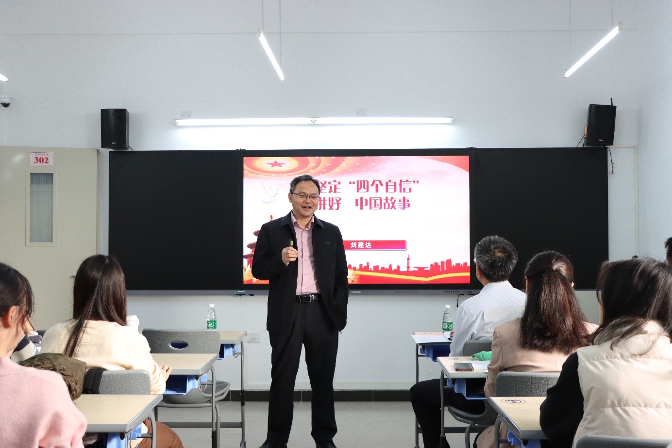 12月16日下午,翻译2002班团支部第四次党史学习教育会、第六次支部大会暨专题生活会在第一教学楼南楼302教室举行。广东外语外贸大学副校长刘建达教授出席本次活动并讲授题为“坚定‘四个自信’讲好中国故事”的思政课。党史学习会由翻译学院党委书记李和民主持,翻译学院党委副书记李海琳、班级导师田璐、辅导员张辉金及翻译2002班全体同学参加。