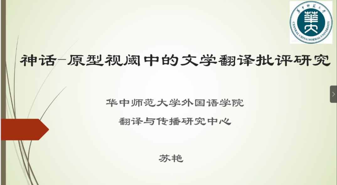 5月26日下午,由广东外语外贸大学黄埔研究院、高级翻译学院共同举办的黄埔大讲堂第12讲、岭南译学前沿讲座第221讲在腾讯会议室举行。华中师范大学外国语学院苏艳教授应邀进行了主题为《神话—原型视阈中的文学翻译批评研究》的学术演讲。本次讲座由广东外语外贸大学高级翻译学院张保红教授主持,并在Bilibili平台同步直播,为高级翻译学院师生及广大翻译爱好者提供了学习与交流的平台。