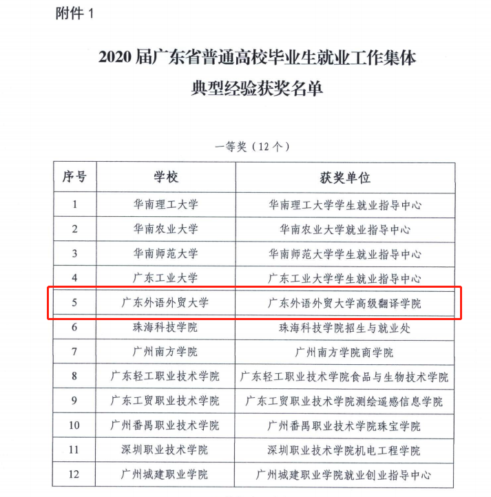 近日,广东省教育厅发文,对2020届广东省普通高校毕业生就业创业工作典型经验集体和个人进行表彰。该项评比活动全省共123所高校提交552份申请材料,全省仅12个学院(部门)获广东省普通高校毕业生就业工作集体典型经验一等奖,我院名列其中。