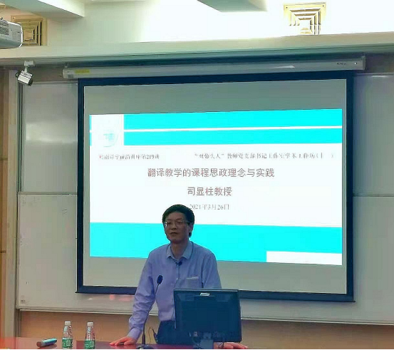 3月26日下午,我院举办岭南译学前沿讲座第219讲暨“双带头人”教师党支部书记工作室学术工作坊(十一)。北京第二外国语学院“翔宇领军学者”、博士生导师、高级翻译学院院长司显柱教授作“翻译教学的课程思政理念与实践”主题讲座,讲座由我院教工党支部书记蓝红军教授主持,近四十名师生参与学习。