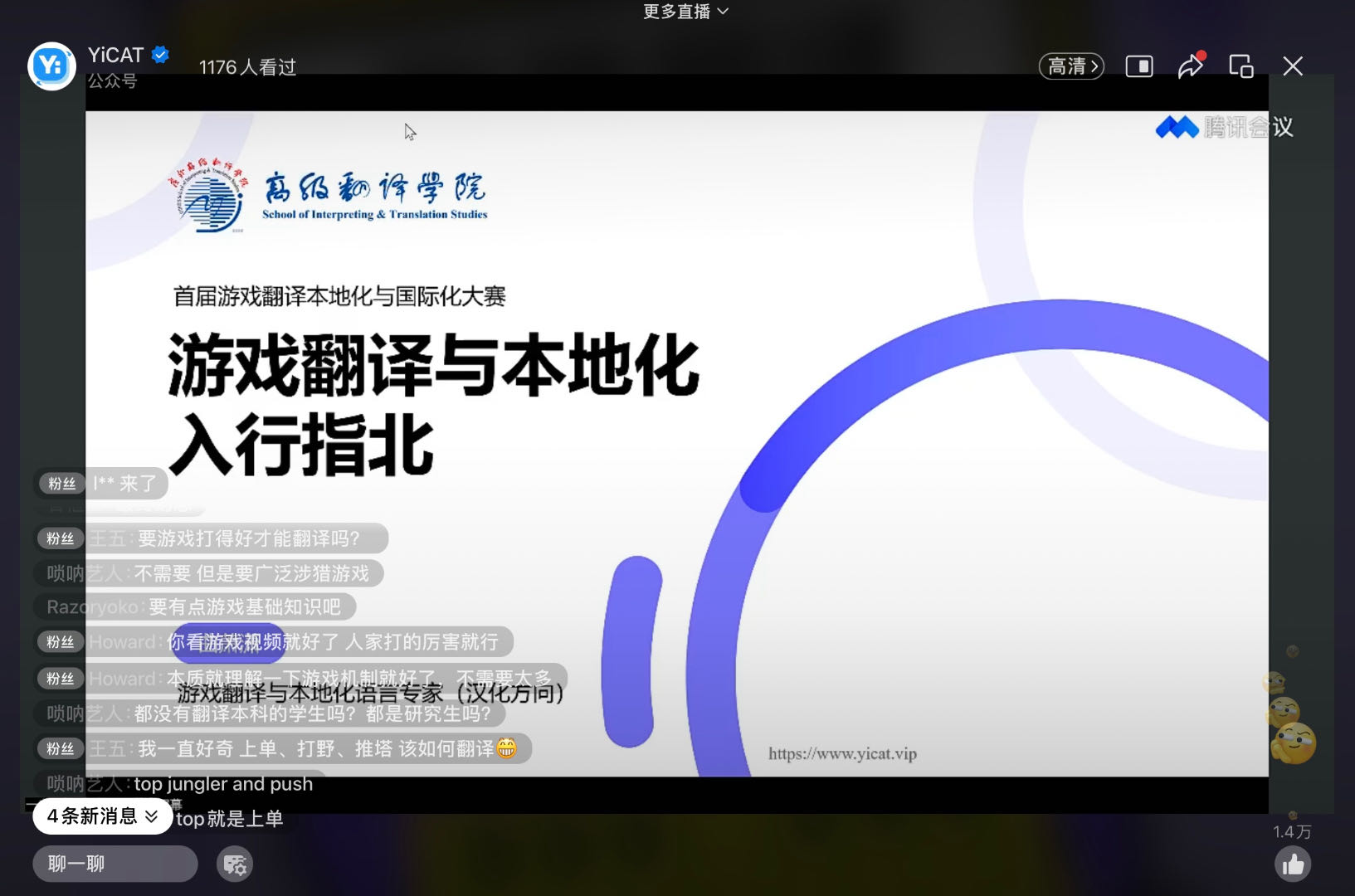 讲座特邀北京译禾信息技术有限公司游戏翻译与本地化(汉化方向)语言专家曲萧潇主讲“游戏翻译与本地化入行指北”,上海一者信息科技有限公司运营经理杨静怡担任讲座主持。讲座通过YiCAT翻译管理平台视频号在线直播,共吸引全国近1200名高校师生和行业人士观看并参与讨论。