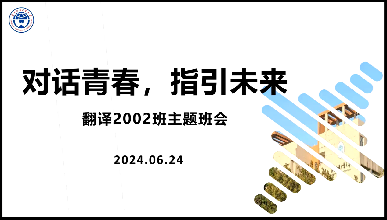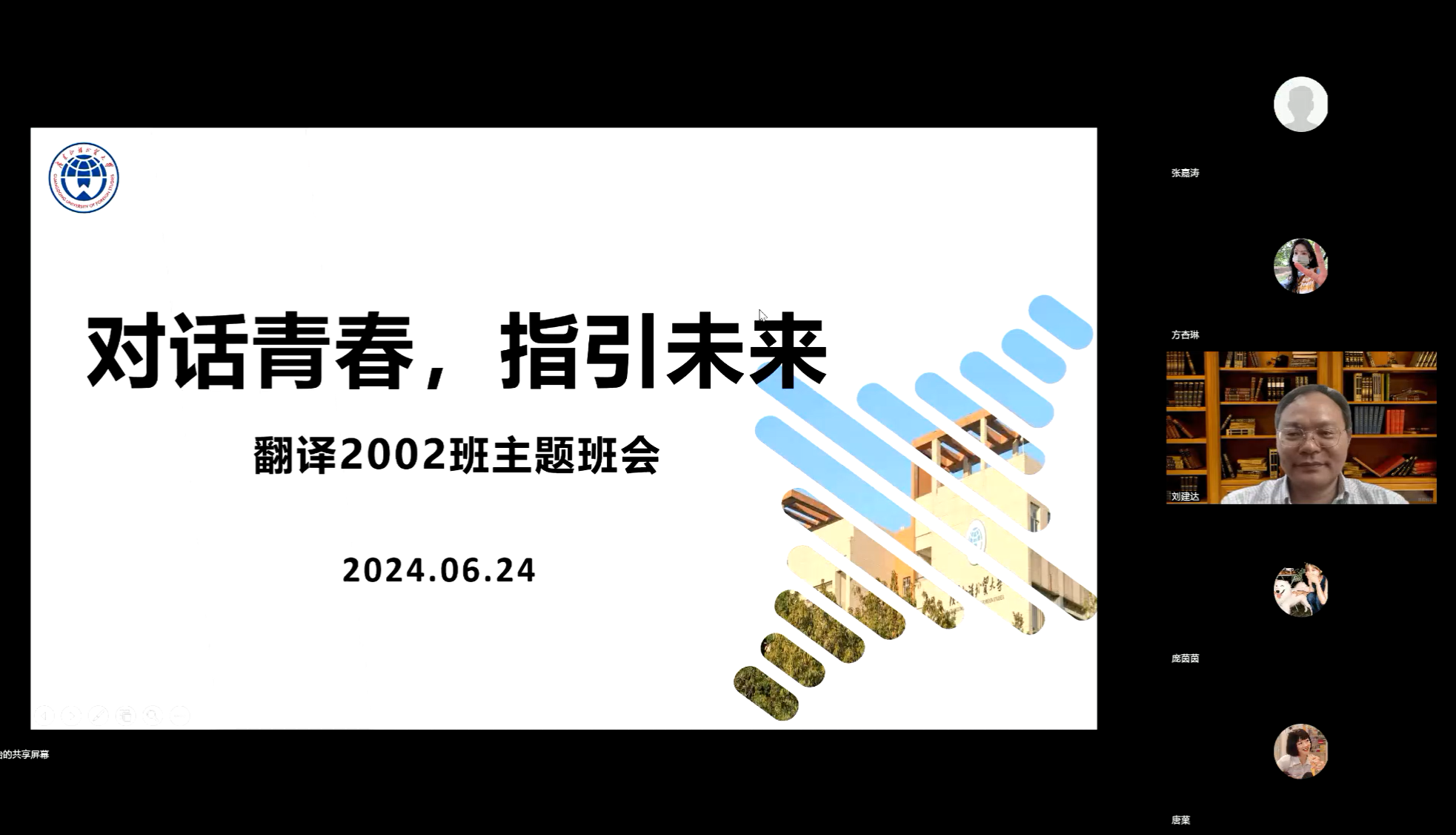 6月24日上午,副校长刘建达教授与我院本科翻译2002班学子开展线上交流会。翻译2002班全体同学参加本次交流会,党委李和民书记、李政鸿副书记出席,活动由辅导员孟令怡老师主持。
