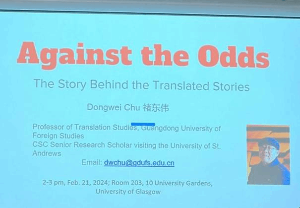 2024年2月21日下午,国家留学基金委高级访问学者、我院褚东伟教授在格拉斯哥大学现代语言与文化学院,举办了一场题为“知难而进:翻译故事背后的故事”的讲座,由格拉斯哥大学翻译学高级讲师乔纳森·埃文斯博士主持,吸引了不少对中国文学英译感兴趣的师生前来聆听。