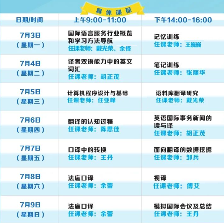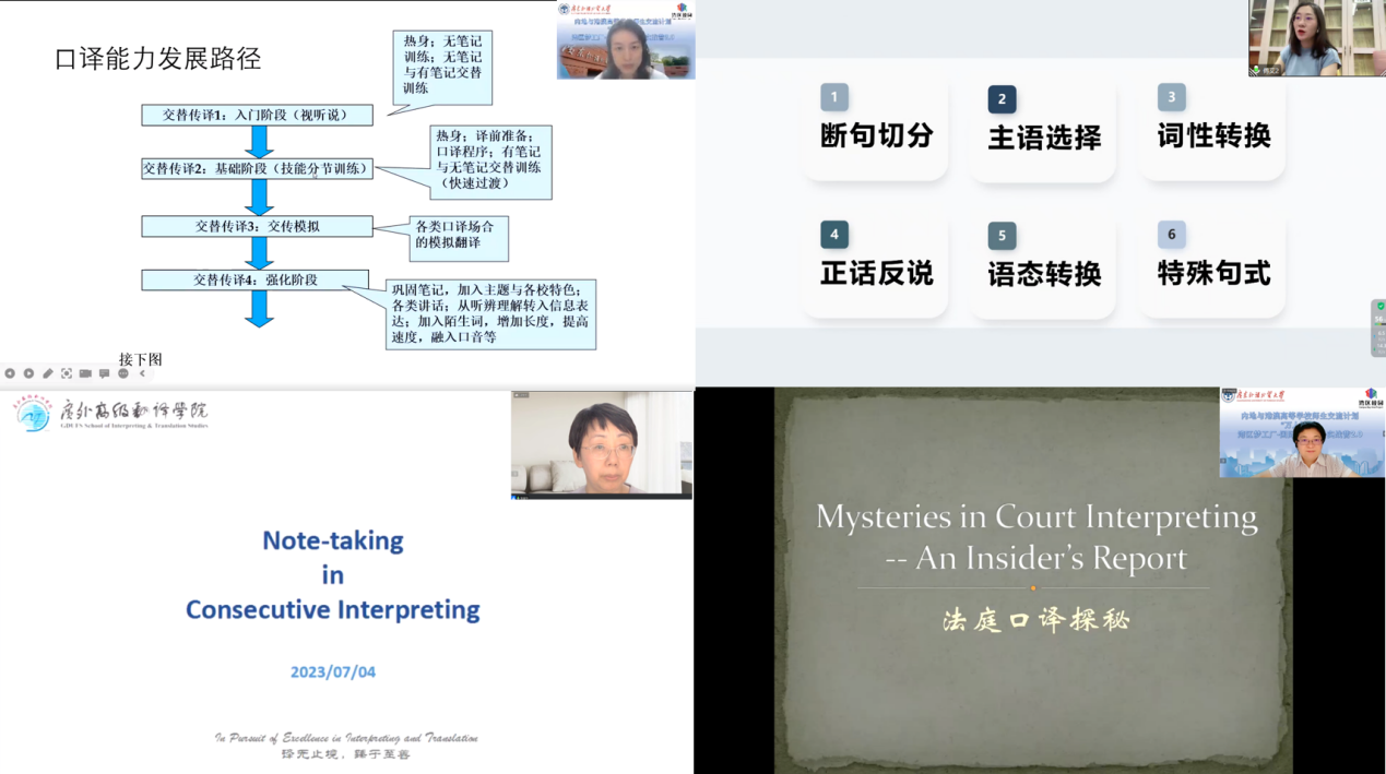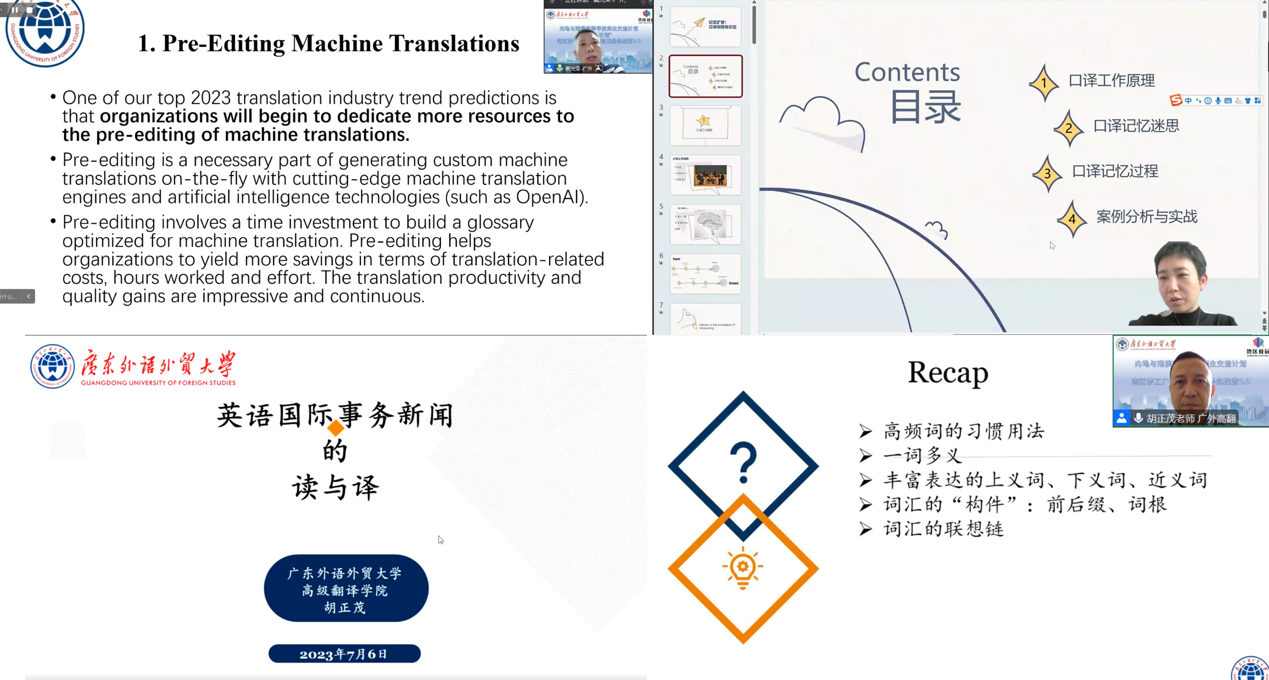 随着实战营的顺利开展,11名主讲老师相继为学员们带来了共计14堂专题课程。课程安排经精心设计,体系清晰、内容连贯、实用性强,体现了广外课堂实践与理论教育的深度融合。口译部分,有王巍巍教授主讲的《记忆训练》、王丹副教授主讲的《口译中的转换》、陈思佳副教授主讲的《翻译认知过程的眼动研究》、余怿老师主讲的《口译学习方法》、张丽华老师主讲的《口译笔记》、傅艾老师主讲的《视译》以及余蕾老师主讲的《法庭口译》;笔译部分,有胡正茂副教授主讲的《译者双语能力中的英文词汇》以及《英语国际事务新闻的读与译》;在技术和应用领域,有戴光荣教授主讲的《语料库翻译研究》、任亚峰老师主讲的《计算机程序设计与基础》,以及邹兵老师主讲的《面向翻译的数据挖掘》。