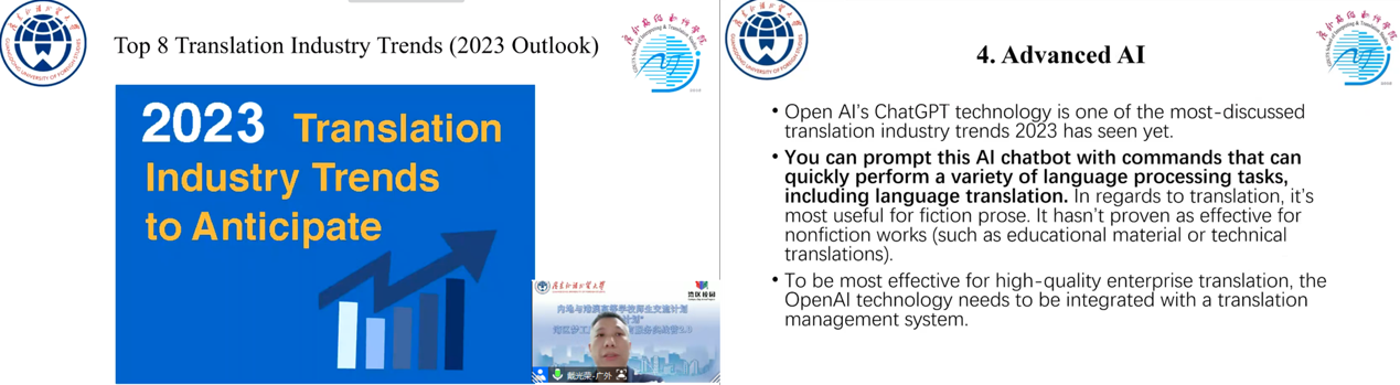 课程伊始,戴光荣教授以宏观的视角为学员们展开了一幅关于国际语言服务行业的全景图,他深入探讨了行业的新趋势以及应对挑战的方法,并分享了适应新科技发展的独到见解。戴教授强调,通过广泛了解语言服务行业、拓宽语言服务技能,我们可知世界充满机遇并能够大有所为。他进一步指出,人才的价值是无法被取代的,眼光敏锐、脚踏实地并积极拥抱新技术的人才定能在行业中施展拳脚。