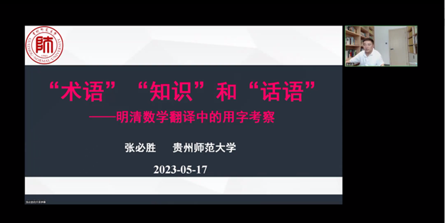 5月17日下午,贵州师范大学张必胜教授应我院邀请邀在腾讯会议举行了主题为《“术语”“知识”和“话语”——明清数学翻译中的用字考察》的学术演讲。本次讲座由高翻学院李明教授主持,翻译专业硕博士研究生及访问学者在线参加。