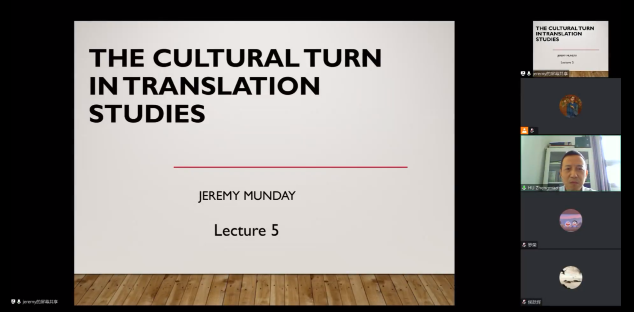 4月3日至5月29日,广东外语外贸大学高级翻译学院通过腾讯会议成功举办“大师论翻译研究”系列讲座。本次系列讲座邀请到国际翻译学界领军者、世界著名翻译理论家、英国利兹大学翻译中心首席教授杰瑞米·芒迪。芒迪教授围绕自己的翻译研究经典书目《翻译学导论》,介绍了翻译学重要的发展趋势和贡献。讲座共七场,由我院戴光荣教授、胡正茂副教授、欧阳倩华副教授、田璐博士和王丹副教授分别担任主持。