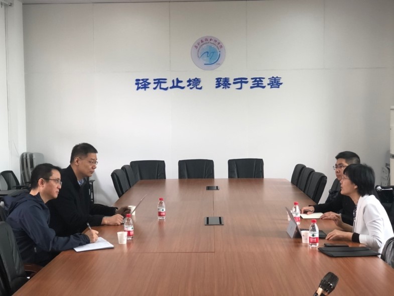 2023年4月26日,传神语联网科技股份有限公司副总裁闫栗丽、传神教育事业部总监张华一行来访广外高级翻译学院。高级翻译学院院长蓝红军、副院长邢杰在四教412会议室参加了调研座谈。