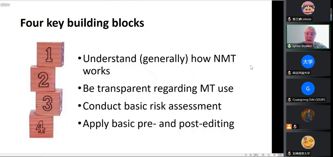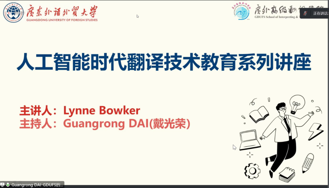 11月3日至11月25日,广东外语外贸大学高级翻译学院于线上顺利举办了主题为“人工智能时代翻译技术教育”的省级海外名师系列讲座。该系列讲座由渥太华大学翻译学教授Lynn Bowker主讲,我院戴光荣教授主持。我院师生以及各高校的翻译学习者和爱好者在同一时间齐聚云端,共同参与讲座。