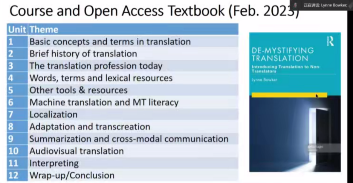 最后一讲Lynn Bowker教授则谈到了面向非专业译员的翻译教学、具体的课程内容以及授课形式,并向大家介绍了她即将出版的新书《揭秘翻译》,此书是面向非专业译员的翻译入门介绍,可帮助非专业译员深入了解翻译。