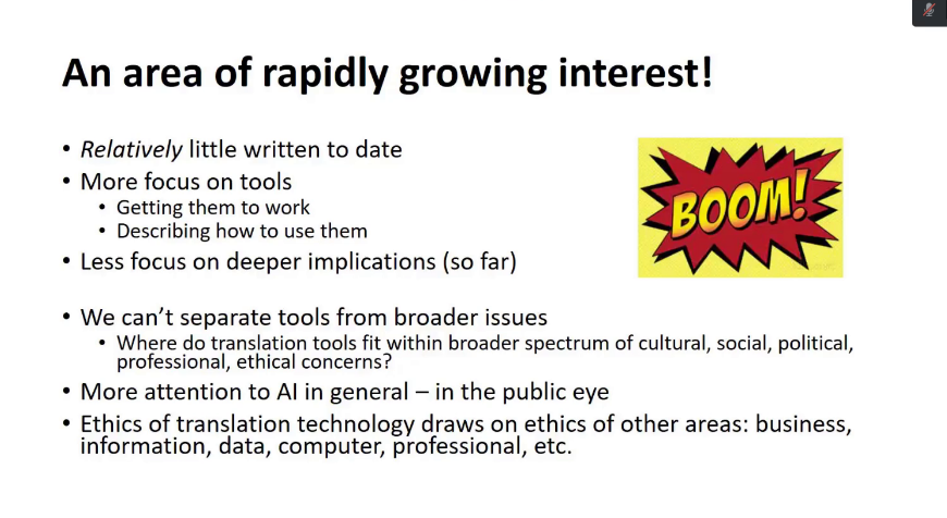 接着,Lynn Bowker教授谈到了机器翻译对社会的影响,例如非专业译员如何了解和使用机器翻译,机器翻译对翻译学习者和专业译员有什么影响,机器翻译在不同领域的使用风险,机器翻译涉及的隐私问题以及其潜在的影响。
