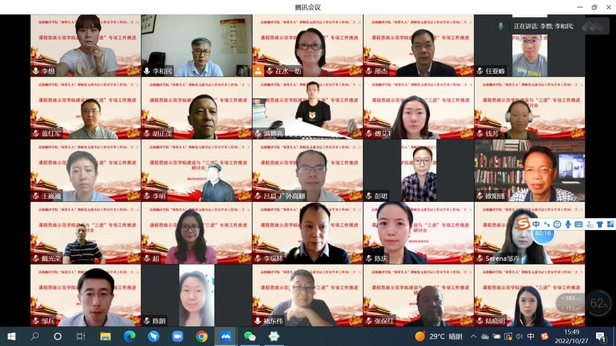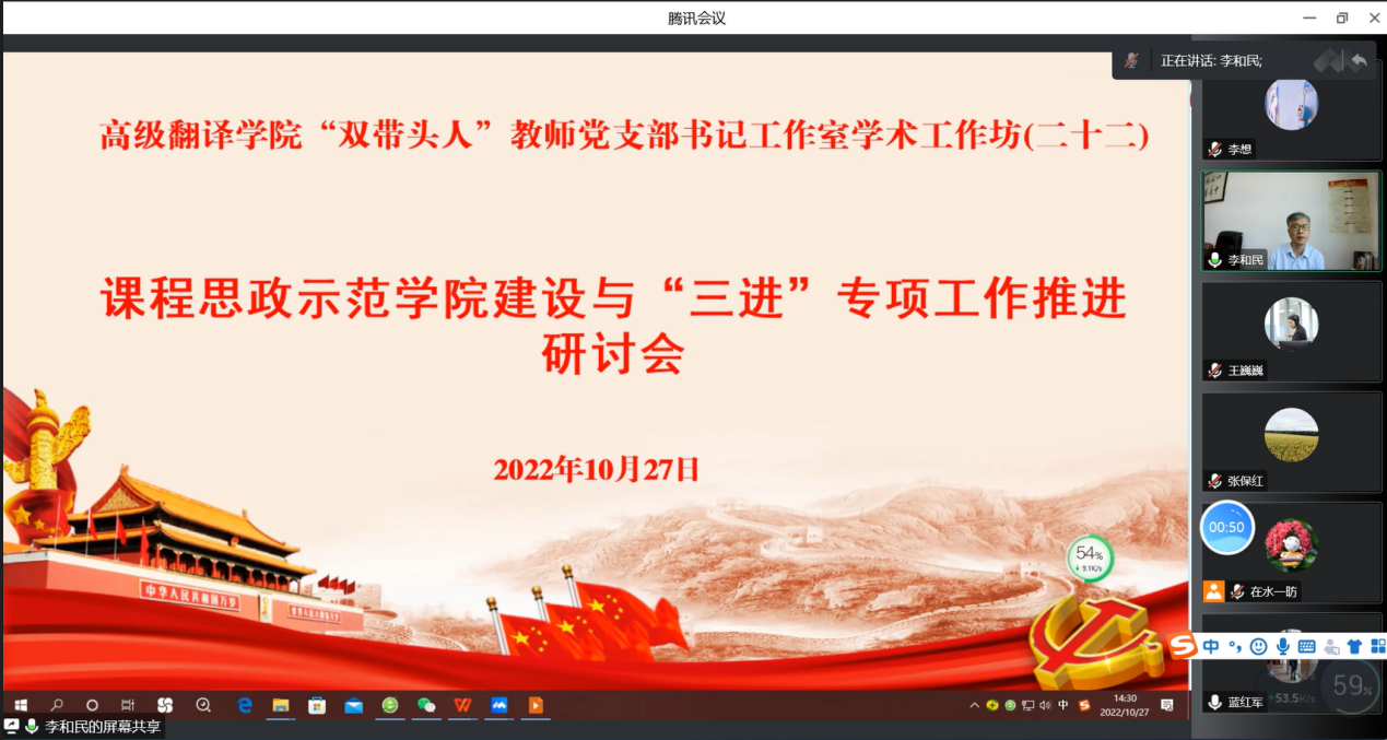 10月27日下午,高级翻译学院举行“双带头人”教师党支部书记工作室学术工作坊(二十二),主题是课程思政示范学院建设与“三进”专项工作推进研讨,活动由学院党委书记李和民主持,全院教职工参加。