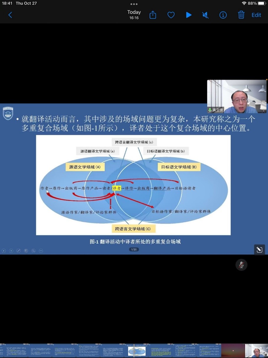 随着讲座的深入,教授提出“场域”概念。译者既可属于目标语文学场域,也来源于源语文学场域,译者借助自己在多重复合场域中的跨界身份,不仅可以推动源语文学向目的语文学的流动,建立两种文学之间的交流,同时也能在很大程度上推动译作在目标语文化中的经典化。