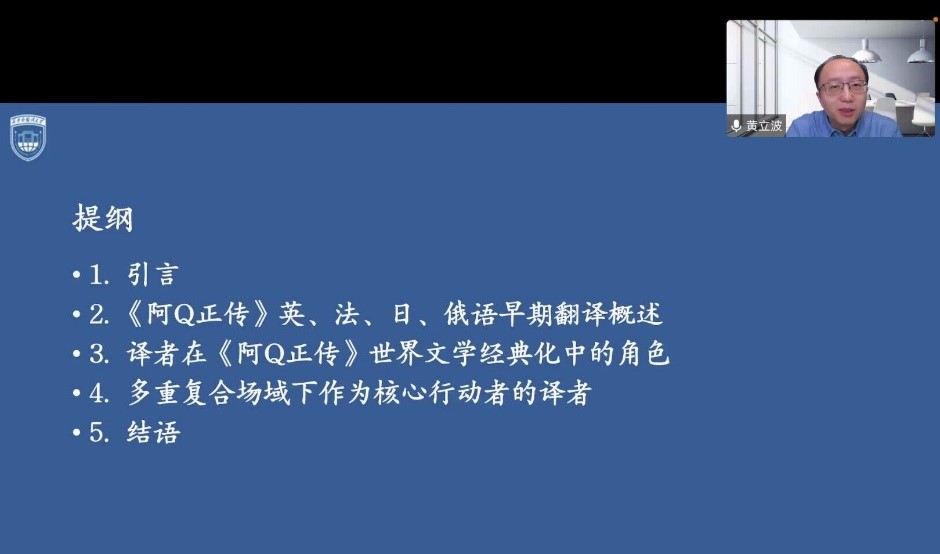 10月27日下午,由广东外语外贸大学黄埔研究院主办、广东外语外贸大学高级翻译学院承办的黄埔大讲堂第36讲、岭南译学前沿讲座第245讲在腾讯会议室举行。本讲特邀西安外国语大学教授、博士生导师黄立波进行题为《<阿Q正传>在世界文学中早期经典化的翻译社会学解读》的学术讲座,由广东外语外贸大学高级翻译学院教授崔英主持。
