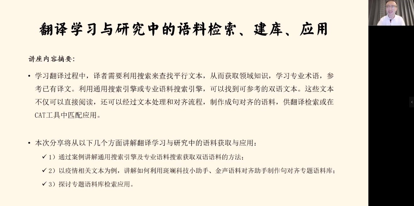 讲座环节,陈杲重点引导线上听众如何高效利用各类技术工具提高翻译实践、学习和研究效率。他讲解了如何科学运用通用搜索引擎和专业语料搜索引擎获取双语文本语料,如何高效利用各种语言资产管理平台和语料对齐平台,制作面向翻译实践、学习和研究特定用途的专题语料库,以及如何利用词性句法标注、双语提取、正则表达式检索、词语搭配检索等技术手段充分挖掘所建专题语料库的潜在功能。讲座之后,陈杲与线上师生围绕语料建库的技术问题以及翻译专业的就业问题等方面进行了交流与互动。