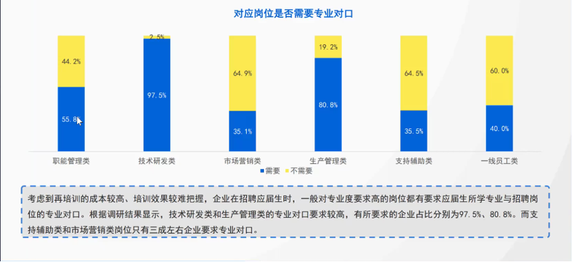 在招聘群体的选择和岗位专业对口方面,目前研发岗位的需求量还是处于供不应求的状态,而该类型的岗位专业对口率最高。对于专业对口率较低的职能管理类、市场营销类、支持辅助类、一线员工类,都是同学们可以进一步探索尝试的领域,潘玫老师鼓励学生积极拓宽职业规划格局。
