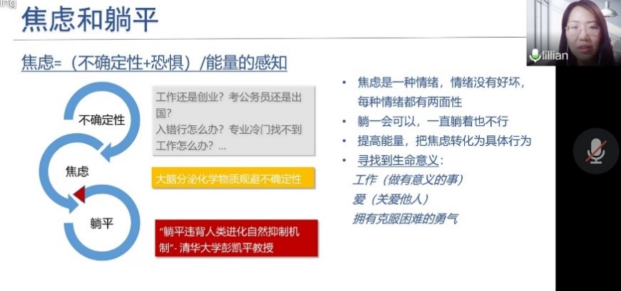 张翎老师则对在校学生的求职心理进行了客观剖析,强调拒绝低效信念。她指出,克服低效信念可以通过与身边的“原型”(正在从事你所感兴趣的行业的那群人)对话,增加自身对该领域的认知,进一步确认是不是自身想从事的方向。