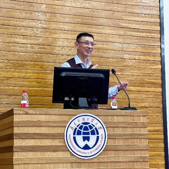 2024年12月12日上午,英国萨里大学英汉口译、技术与人工智能学科点联合创始人林超伦博士来访我院,并为我校师生带来“AI翻译的认知误区”主题讲座,讲座于白云山校区图书馆报告厅内举行。