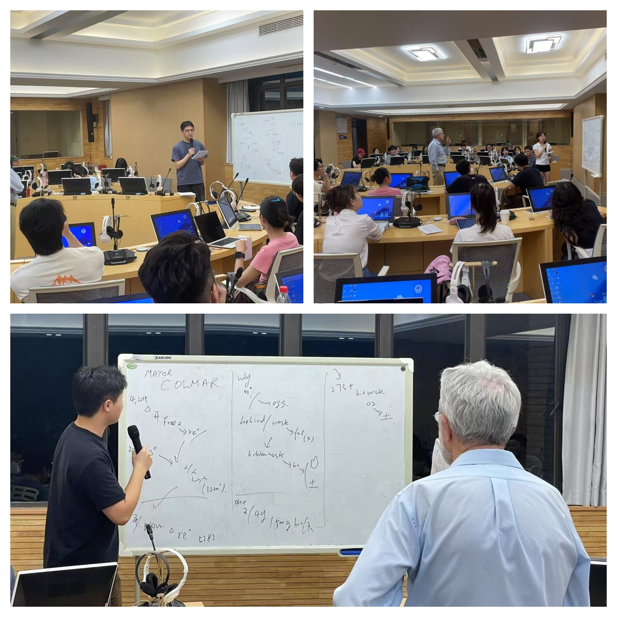 4月25日,David Smith与我院教师王丹副教授在六教A201教室开展中进英同传联合教学。 David Smith从英语视角切入,对学生的录音进行逐一点评,通过实际案例引导学生思考如何通过简化、调整用词和语言结构来提升语言输出质量,让学生更加注重英语的行文习惯,来自英语母语者的点评大大增强了学生的听众意识和交流意识。王丹则从中文语境出发,强调学生应该通过分析句子来分清信息的主次,运用简单句型将关键信息带出。此次联合教学内容详实,丰富了学生对于同传信息处理与表达技巧的认知。