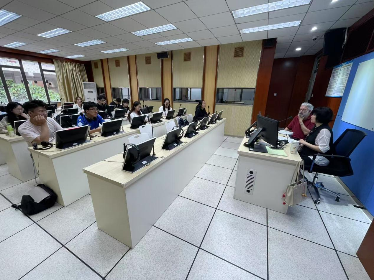 2025年4月24日至25日,欧盟口译司原英语处处长David Smith受邀对我院进行访问,期间为我院学生讲授“交替传译笔记”大师课,并与我院教师王丹副教授进行联合教学。
