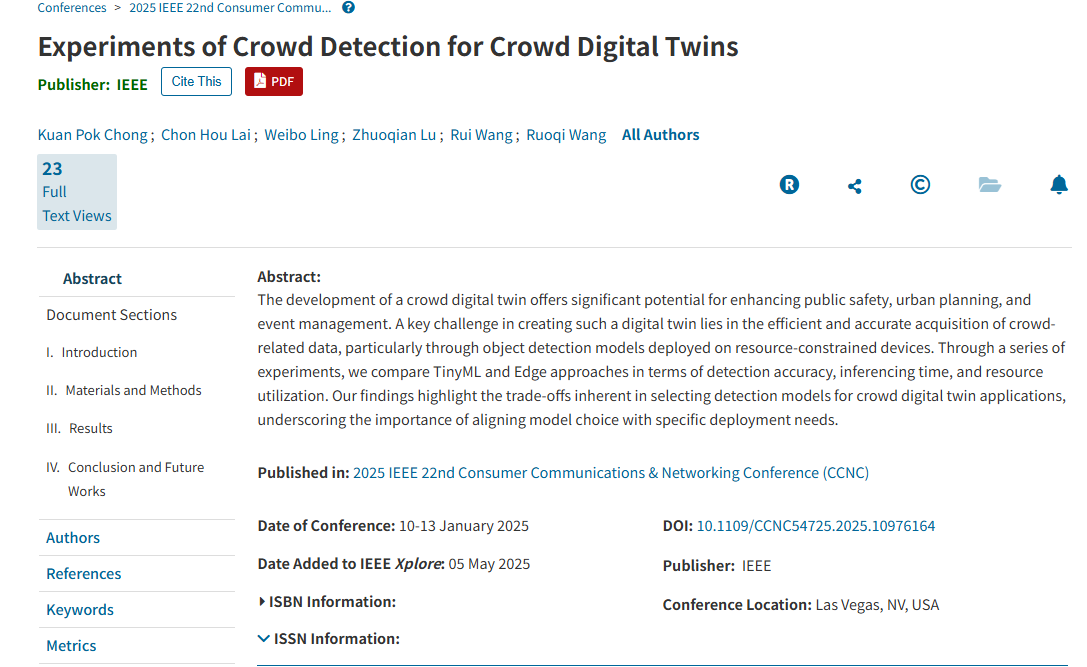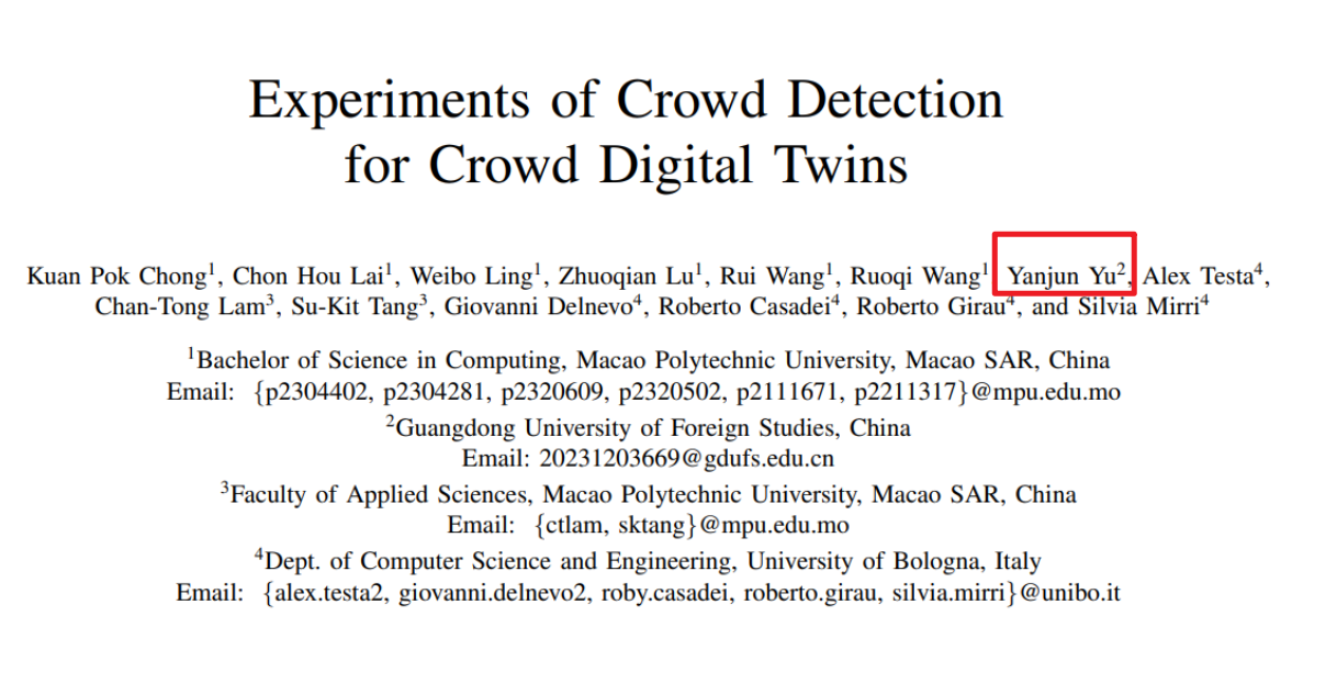 近日,我院2023级翻译-计算机合作办学专业本科生余彦君,作为共同作者,与澳门理工大学6名本科生以及澳门理工大学、意大利博洛尼亚大学的教授合作撰写的论文,被2025年IEEE第22届消费者通信与网络会议(IEEE 22nd Consumer Communications & Networking Conference, CCNC 2025) 录用并正式发表,印证了广外-澳理大合作办学"语言能力×计算思维"培养模式的显著成效,也为项目学生开辟了学术发展新赛道。
