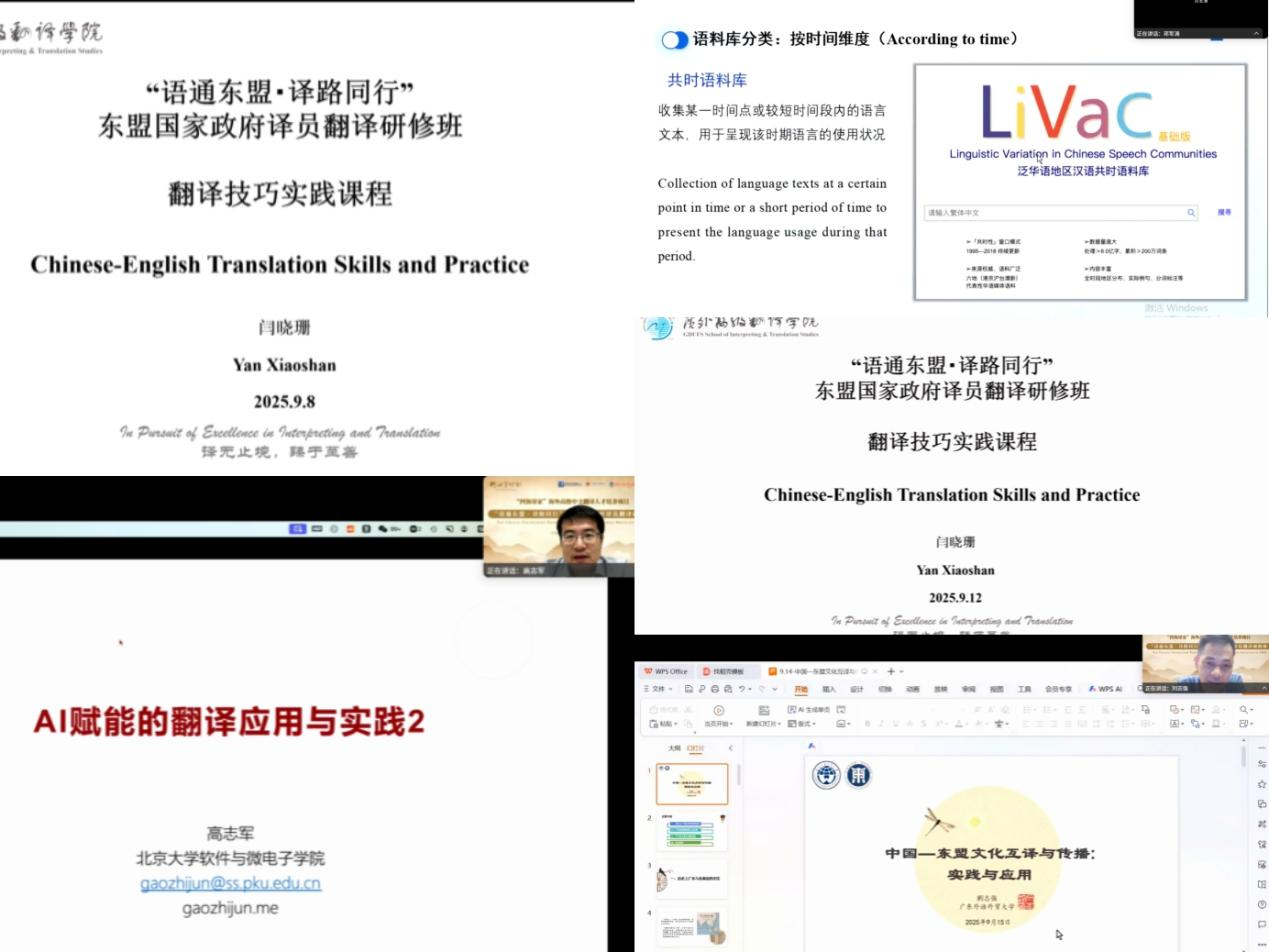 本次研修课程共设置十场专题培训,内容系统全面。清华大学张颖教授首讲深入解析中国政治体制核心概念,详细阐释“全国人大”、“国务院”等机构的英文译法,重点解读“人类命运共同体”的译法演变和“中国式现代化”的五大特征,强调政治话语中比喻修辞的文化内涵与翻译处理。北京外国语大学彭萍教授系统讲解中国特色政治表达的三大特征,通过“京剧”译作“Beijing Opera”、“龙”推荐译为“loong”等实例,演示如何平衡直译与意译,并特别指出中文繁复表达英译时的简化策略。广东外语外贸大学闫晓珊老师通过三场实践课程,深入讲解文化差异对翻译的影响,以广外昵称翻译等生动案例,演示文化专有项的处理方法,包括注释、文内解释、归化等技巧,并指导学员处理中文无主句、虚实词和排比隐喻等难点。北京外国语大学张威教授重点分析“中华民族伟大复兴的中国梦”等表述的翻译策略,强调“以我为主、融通中外”的原则,提醒避免因翻译不准确导致国际误解。在技术应用方面,广东外语外贸大学苏雯超教授系统介绍翻译技术从计算机辅助工具到神经机器翻译的发展历程,详细讲解智能CAT工具、AI增强译后编辑等四大实践路径。北京大学高志军老师聚焦大语言模型应用,现场演示术语提取、文档翻译等技术,重点讲解提示词优化和工作流程设计,并通过北大研发的翻译辅助系统展示AI如何提升翻译质量。武汉工程大学邓军涛教授完整介绍语料库建设八步法,演示八爪鱼采集器和E-corpus平台的操作使用,讲解历时语料库与共时语料库的分类及应用价值。广东外语外贸大学刘志强教授从历史渊源切入,详细介绍汉代以来广东与东南亚的交往历史,引用最新贸易数据说明中国—东盟经贸关系现状,并分享广外越南语、马来语等八个语种专业建设成果,包括百册中华文化经典东盟语种翻译项目、东南亚文化风情节等文化交流实践。