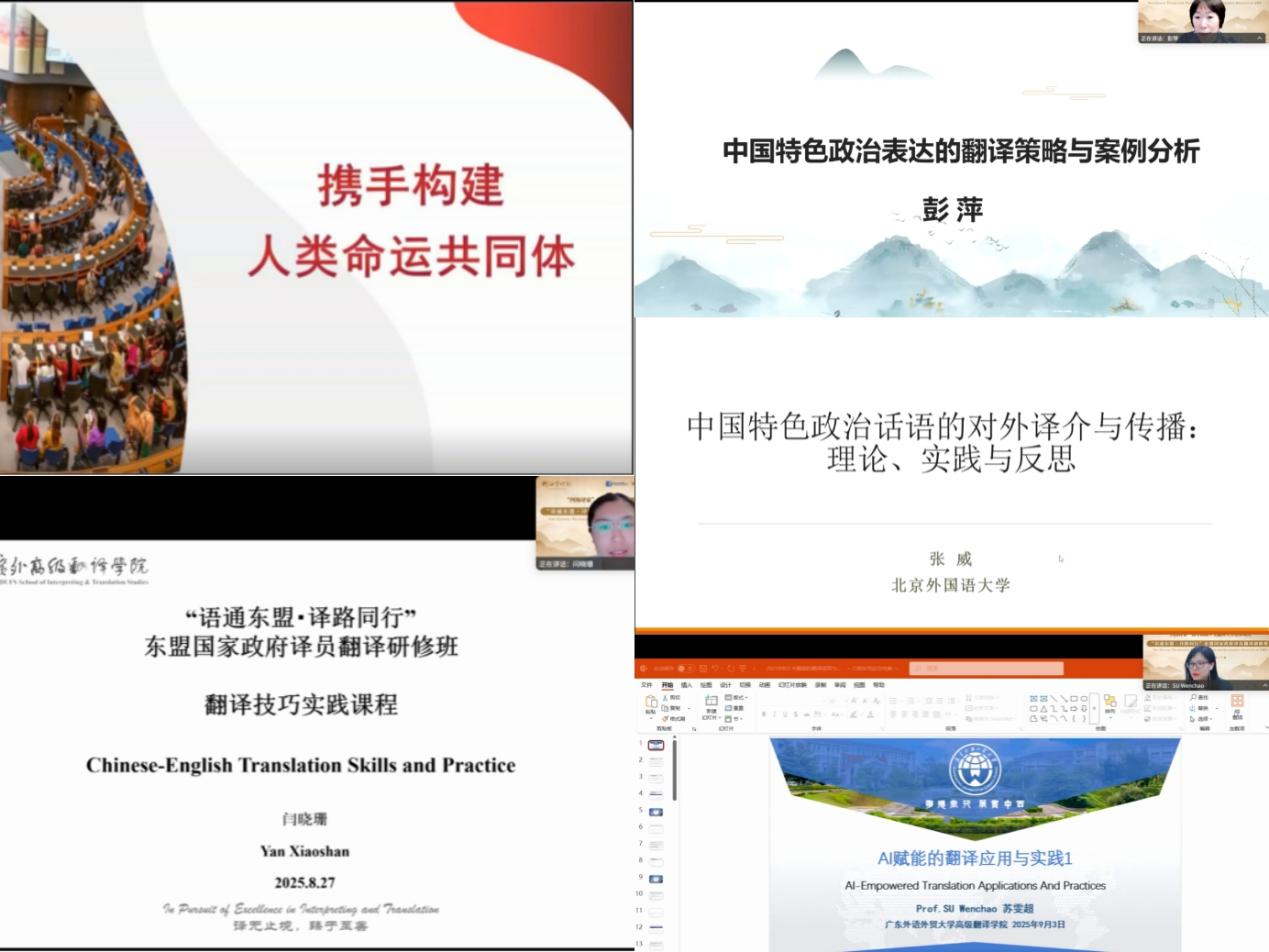 2025年8月25日至9月12日,由教育部中外语言交流合作中心、中国—东盟中心与广东外语外贸大学联合主办的“语通东盟·译路同行”东盟国家政府译员翻译研修班在线上顺利举行。本次研修班由我院高级译员研修部策划并具体执行,旨在落实中国—东盟人文交流合作共识,推动区域语言人才队伍建设,提升东盟国家译员对中国特色政治话语的理解与翻译能力。本次线上研修班学员涵盖东盟多国政府外交官员以及广东外语外贸大学硕士研究生,构成多元而充实的学习共同体。