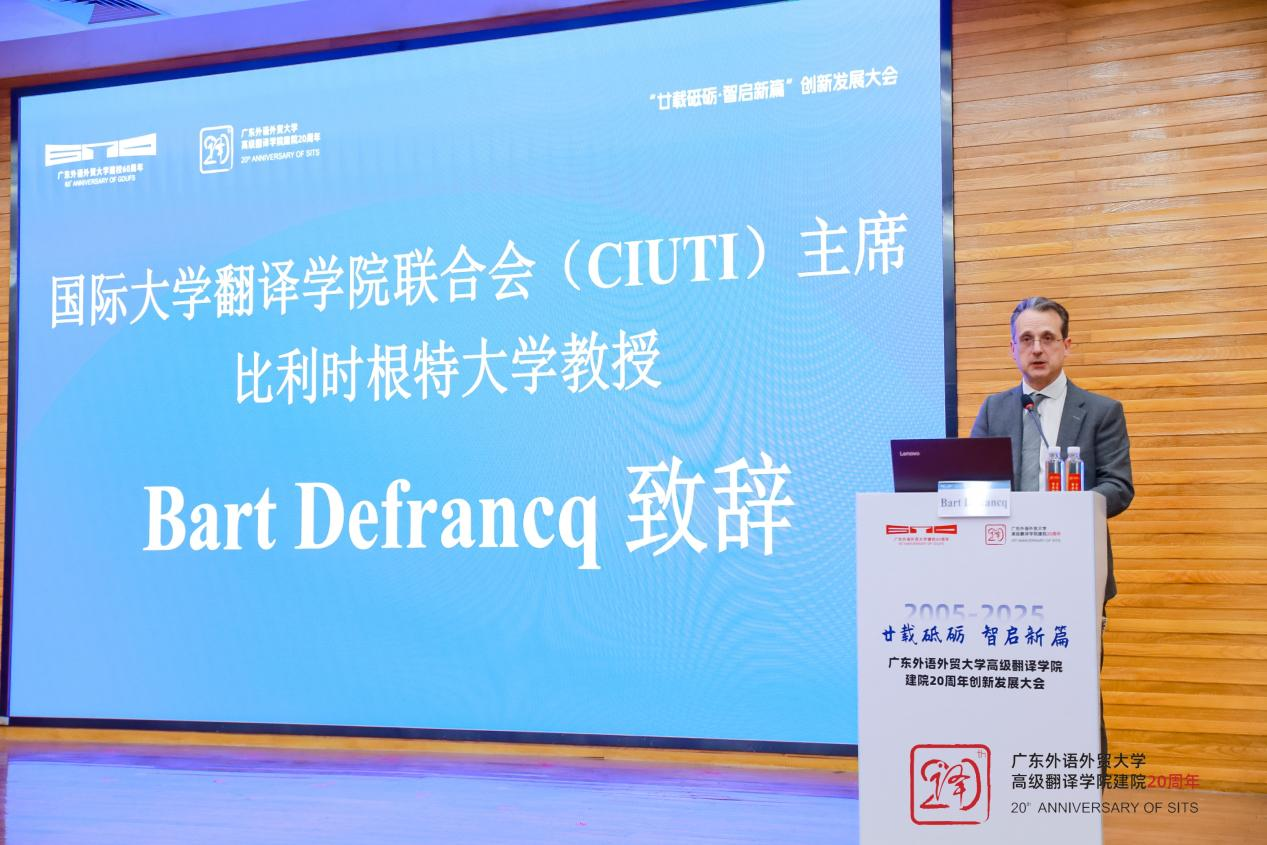 国际大学翻译学院联合会(CIUTI)主席、比利时根特大学教授Bart Defrancq发表致辞。他回望CIUTI与广外高翻学院自2011年结缘以来的合作历程,对学院取得的成就表示高度赞赏。他指出,在全球化和技术变革的双重背景下,国际翻译教育界更需携手共进,广外高翻学院在推动翻译与人工智能融合方面的探索“为全球翻译院校提供了宝贵借鉴”。