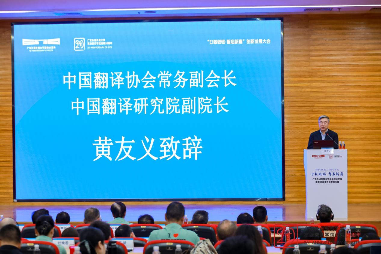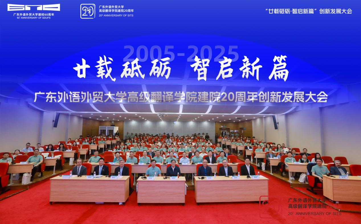 2025年11月1日上午,广东外语外贸大学高级翻译学院建院20周年创新发展大会在白云山校区图书馆报告厅隆重举行。大会以“廿载砥砺·智启新篇”为主题,回顾学院二十年发展成就,共话人工智能时代翻译教育未来。校领导,国内外翻译界专家学者,退休、曾在学院工作过的教职工,校友代表,学院全体教职工,学生代表200多人齐聚一堂,共襄盛典。