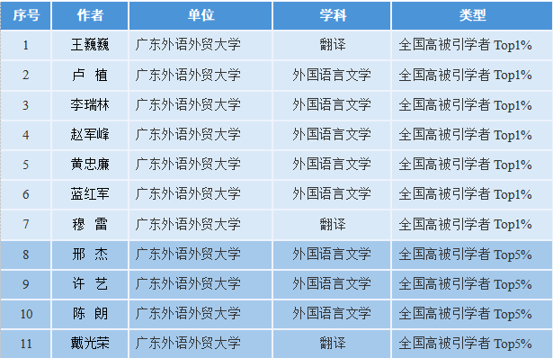 近日,中国知网学术评价支撑平台发布了“2025全国高被引学者”名单。我院11位教师入选外国语言文学或翻译学科高被引学者,其中,王巍巍、卢植、李瑞林、赵军峰、黄忠廉、蓝红军、穆雷等教授(按姓氏笔画排序,下同)入选“2025年全国高被引学者TOP1%”,邢杰、许艺、陈朗、戴光荣等教授入选“2025年全国高被引学者TOP5%”,入选学者数量在同类院校中位居于前列。