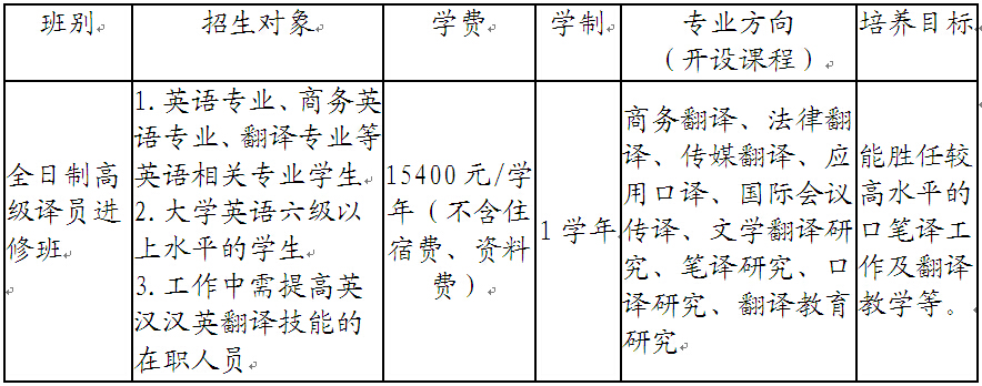 (3)先进的培养方式:学员培养以全日制为培养模式。学员与本院翻译学硕士研究生和翻译专业硕士研究生纳入统一管理,共享广外浓郁的学术氛围、齐全的图书资料、先进的教学设备、丰富的文体设施、优质的住宿条件。学员插班到学院的正式研究生班级中听课和学习,每学期根据研究生的课程安排和个人学习需求选择至多6门课程进行学习并获得相应学分。1学年内修满16学分即可获得高级翻译学院颁发的结业证书。