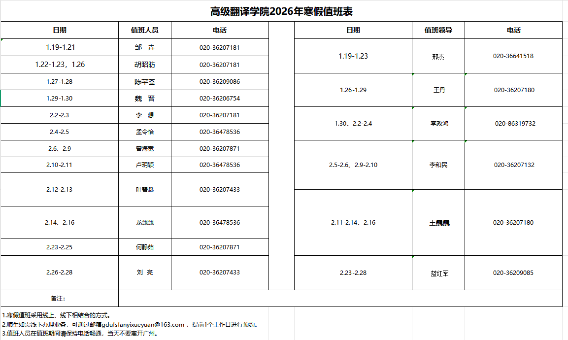 高级翻译学院2026年寒假值班表