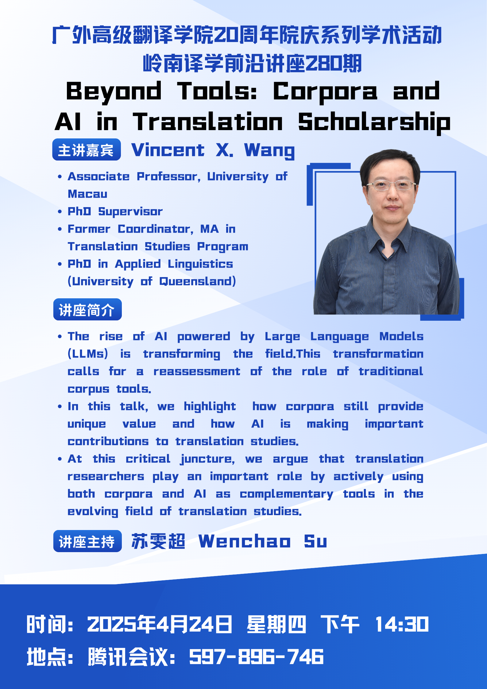 Beyond Tools: Corpora and Al in Translation Scholarship(王宪 副教授/澳门大学)