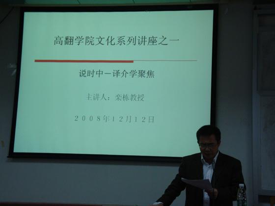 2008年 12月12日下午2:30,由我校外国文学文化研究中心主任栾栋教授主讲的《说时中――译介学聚焦》在四教424课室准时开讲。该讲座作为高翻学院文化系列讲座的第一讲,受到广大师生的热烈欢迎。我院梁学宏书记、余东院长、莫爱屏副院长出席了本次讲座,来参加讲座的还有来自其他学院的教师和学生,偌大的教室内座无虚席。栾栋教授的讲座角度新颖,博古通今,出入中西而又不失睿智风趣,更是让听众在两个小时的听讲中加深了对译介学的了解,饱尝了丰富的翻译文化盛宴。
