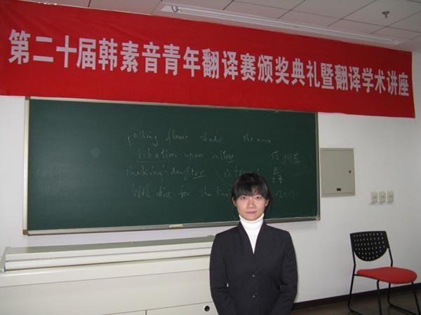 第二十届韩素音青年翻译奖竞赛颁奖典礼于2008年10月24日晚七点三十分在中国人民大学明德堂举行。在本次大赛中,我院研究生赵南获得汉译英组三等奖的好成绩。